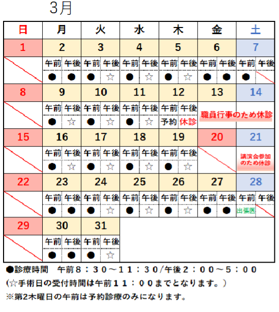 3/28(土)出張医 和田医師の診察(院長は不在)