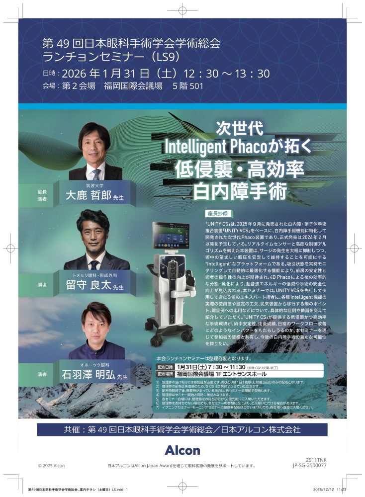 さて、1月末は福岡にて第49回眼科手術学会総会に参加して参りました。ランチョンセミナーでは、元日本眼科学会会長 大鹿 哲郎教授のもと、留守先生と共に、最新の白内障/硝子体手術装置 UNITY VCSの講演をさせて頂きました。本学会以降、今後は白内障手術のみバージョンのUNITY CSも発売を控えており、来週末はそちらのLaunch Seminarにおいても講演させて頂きます。